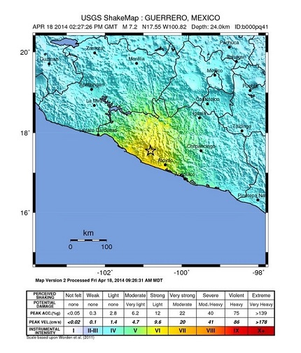 On the morning of April 18, 2014, an M7.2 earthquake struck southwestern Mexico, 37 km north of the municipality of Tecpan de Galeana (approximate population 53,000). The epicenter is located 273 km southwest of Mexico City and lies between the resort cities of Acapulco and Zihuatanejo, where many residents and tourists are staying during the run-up to Easter. According to the United States Geological Survey (USGS), the earthquake occurred at 09:27:26 AM local time on April 18 (14:27:26 UTC) and struck at a depth of 24.0 kilometers. The U.S. Pacific Warning Center has issued a statement indicating that there is no tsunami threat.