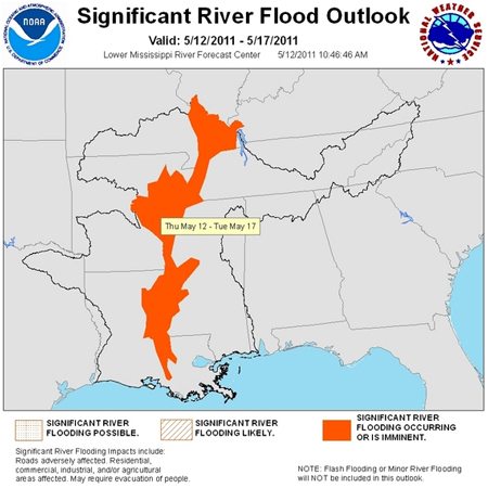 The National Weather Service has provided a five day significant river flood outlook for the Upper and Lower Mississippi River Region. This outlook, in the form of a footprint showing significant river flooding occurring or imminent, is shown below.