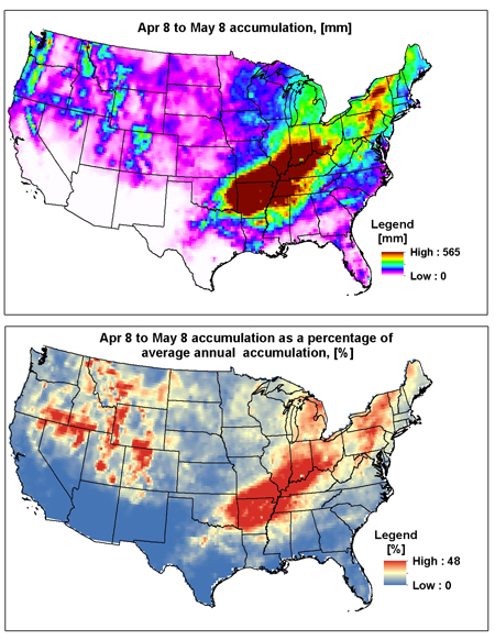 Figure 2: (Top) Precipitation Accumulation for the period April 8-May 8, 2011. (Bottom) Comparison of precipitation data for April 8-May 8 of this year with average annual precipitation accumulations (Source: AIR using data from http://www.cdc.noaa.gov/cdc/data.unified.html).