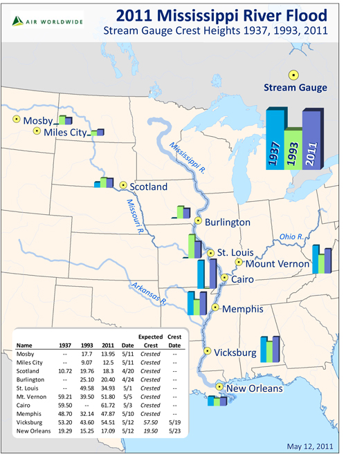 Figure 4: Comparison of water levels for the 1937, 1993 and 2011 great floods; in numerous locations along the Lower Mississippi, the 2011 crest heights exceed record heights (Source: AIR using data from http://waterdata.usgs.gov/nwis and http://water.weather.gov/ahps/).