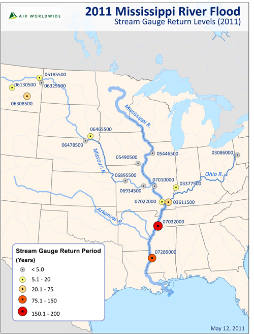 Figure 3: Return periods for available USGS gauging stations reveal that the flooding on the Mississippi River reflects an event with a return period of over 100 years (Source: AIR using data from http://waterdata.usgs.gov/nwis and http://water.weather.gov/ahps/).