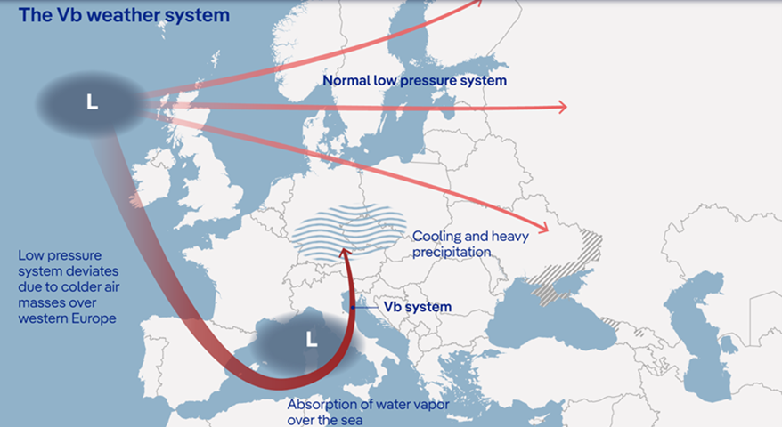 Like the June flood event in Europe that primarily impacted Germany, this event was caused by a Vb (“five-b”) weather system, a relatively unusual setup that can lead to significant extended periods of rainfall thus causing flooding. In this setup, colder air over Europe drives these low-pressure systems southward toward the Mediterranean Sea as they approach the continent. A Vb system then picks up warm, humid air from over the Mediterranean, leading to prolonged and intense rainfall as it tracks back northward. The continent-spanning flooding of 2002 - which also caused significant impacts in Germany - was also driven by this Vb setup, shown in the image below: