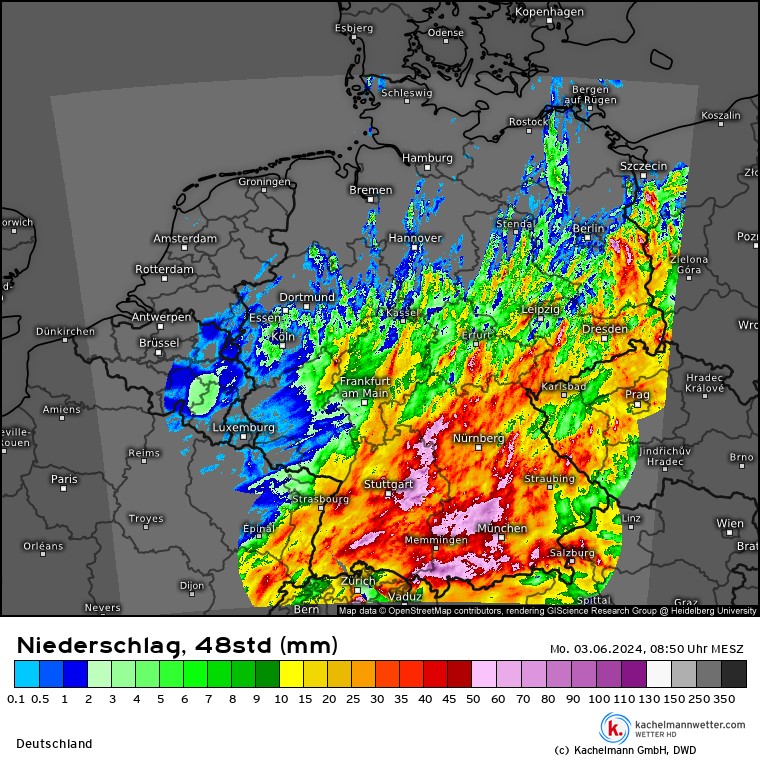 Impacts have been widespread across southern Germany. In Bavaria, the main flooding concerns have increasingly concentrated on the Danube, which saw warning level 4 (highest level) reached in many locations. The positive news for this section of the Danube is that flood waters are expected to recede as this week progresses. Elsewhere, in Baden-Wurttemberg, 100-year floods have been observed at the Gollsdorf gauging station on the Prim tributary of the Neckar, the Haubersbronn gauging station on the Wieslauf tributary of the Rem, and Leutenbach station on the Buchenbach tributary of the Mur. 10- and 15-year floods have also been observed at Heidelberg and Gundelsheim on the Neckar, respectively. In Reichertshofen, two dams broke despite being fortified with sandbags, allowing the Baar to flood nearby neighborhoods. The Upper Rhine (5-to-10-year flooding at Maxau and Worms) and Paar (more water discharged than a 100-year flood) have also seen impacts.