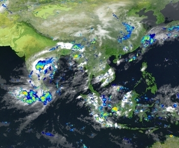 Figure 2: Satellite Image of Cyclone Laila (Source: NOAA). After landfall , the storm re-curved to the northeast, towards Orissa. The following day, May 21, Laila weakened to a depression and was centered over coastal Andhra Pradesh, about 100 km west of Kakinada. Heavy rains devastated large coastal stretches of the states of Tamil Nadu and Andhra Pradesh. Three districts of Andhra Pradesh--Nellore, Prakasam, and Guntur--were particularly hard hit. The towns of Addanki and Ongole received 55 centimeters and 32 centimeters of rain in a 24 hour period, respectively. Additionally, storm surge between 1.5 and 2 meters high inundated Andhra Pradesh’s coastal villages. The image below from the Japanese Aerospace Exploration Agency (JAXA) shows that precipitation intensities in excess of 50 mm per hour were occurring over land northwest of the storm's center at the time of landfall (Figure 3).