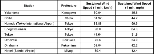Yesterday, Sunday, the city of Nagoya issued an evacuation advisory to more than 50,000 residents, anticipating possible flooding from swollen rivers. A similar advisory was issued for more than 10,000 people in Ishinomaki, Tohoku, in the north. Other local governments, according to news reports, also issued evacuation advisories. In the mountains of Shizuoka Prefecture, west of Tokyo, more than six inches of rain fell in less than six hours. The cities of Fujinomiya and Hamamatsu in that prefecture received 120 millimeters of rain an hour (4.75 inches), prompting the JMA to issue an alert that a record-breaking deluge might ensue. The Agency warned of torrential rain, thunderstorms, and high waves along coastal areas. It forecast rainfall of up to 400 mm (15.75 inches) in the Tokai region and 200 mm (7 inches) in Tohoku and Hokuriku over the 24-hour period through Monday evening local time. Some areas, the JMA said, could receive up to 80 mm (3.15 inches) per hour of rain. Heavy rain was also expected in mountainous areas of the Iwate and Miyagi Prefectures of Tohoku in the north. Jelawat produced typhoon-force gusts as high as 120 km/h at Tokyo’s Haneda International Airport Sunday evening local time, and the JMA warned Tokyo residents to stay indoors while Jelawat passed by that night. By morning, Jelawat’s winds had weakened to less than 100 km/h, to tropical storm status. The table below shows sustained wind speeds for several selected cities.