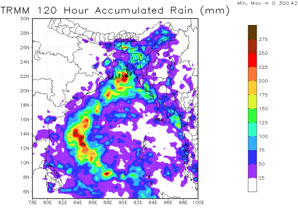 The first tropical cyclone in the Northern Indian Ocean this season, Tropical Cyclone Mahasen, made landfall northwest of Chittagong, Bangladesh, at about 0600 UTC (2 a.m. EDT) on Thursday May 16. Earlier this week the storm killed at least seven people in Sri Lanka before making a slow passage across the Bay of Bengal. As it came ashore in Bangladesh, Tropical Cyclone Mahasen delivered torrential rain of 250mm or so and maximum sustained winds of up to 100km/h (60mph), destroying thousands of poorly constructed homes. Its arrival coincided with low tide, but storm surge still caused waist-deep flooding in some areas of this low-lying coastline. As many as a dozen fatalities have been reported, caused by drowning and falling trees, and at least 50 people have been injured.
