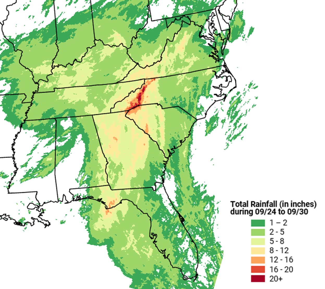 Figure 1: Observed rainfall totals in Southeast United States from September 24 through 30, derived from the National Weather Service (NWS) and National Water Model Analysis datasets